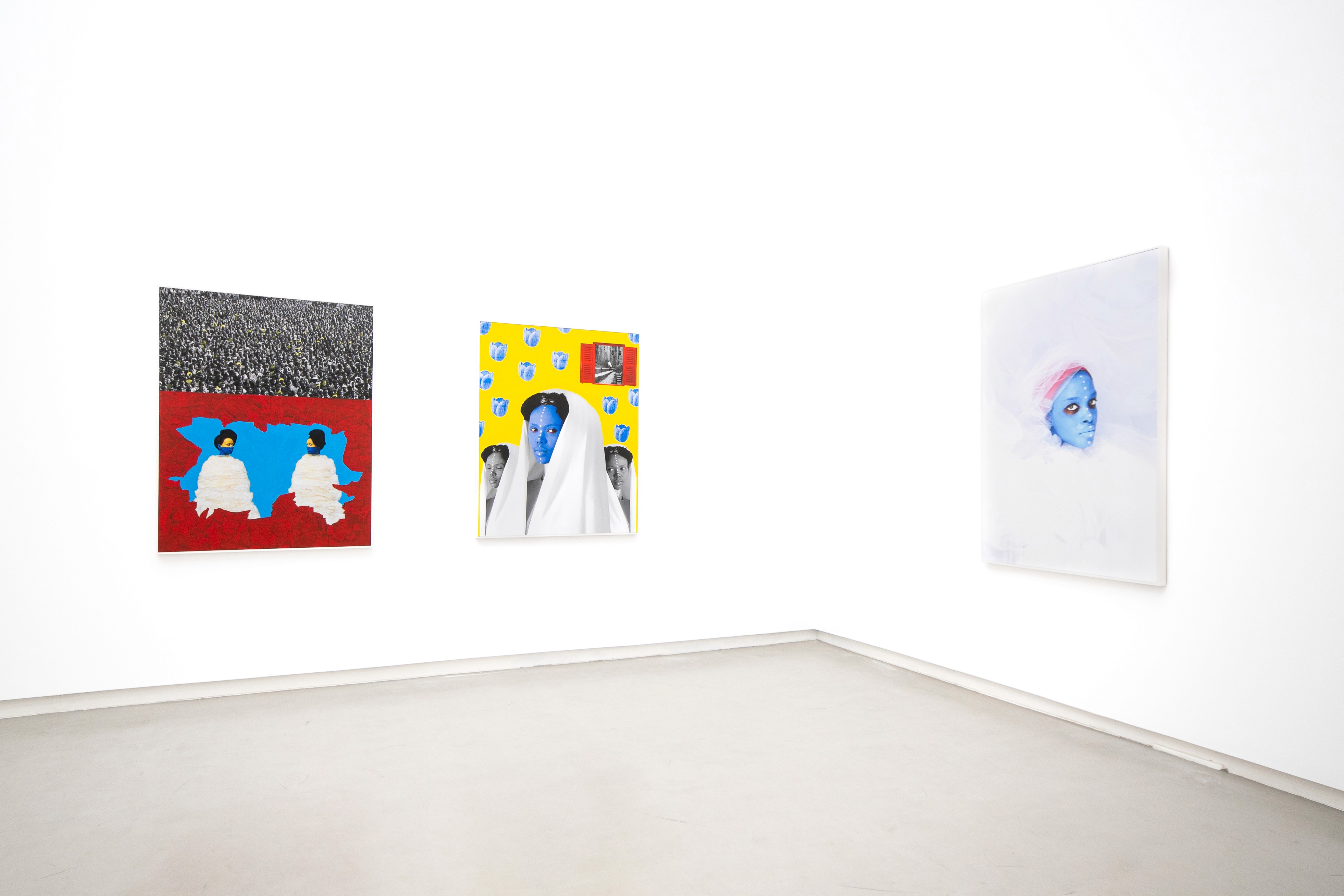 The use of her earliest images her documentary or photojournalistic period - which suddenly become archival, underscores the invisible bond between this dual figure and the crowd evolving behind a wall of clichés and received ideas. Despite the opening created, the crowd appears determined to remain within this uncomfortable zone of political and societal comfort. Here, the back and forth and the possibility of transformation perceived throughout the series seem blocked, despite the artist’s efforts to make - two seemingly incompatible worlds coexist. What renders Muluneh’s new work so resonant is undoubtedly her choice of allegory. The dominance of red and blue is far from incidental. Blue is the coldest colour on the chromatic circle; in false-colour thermographic images, it invariably signifies cold. Classical painting teaches that atmospheric perspective consists in bluing distant forms, and that shadows in recesses are cooler and darker than local tones. Red, by contrast, functions as the colour of shock, fire, violence, and malevolent spirit, but also as the divine colour of a supernatural world of joy and redemption - as in cardinal purple.