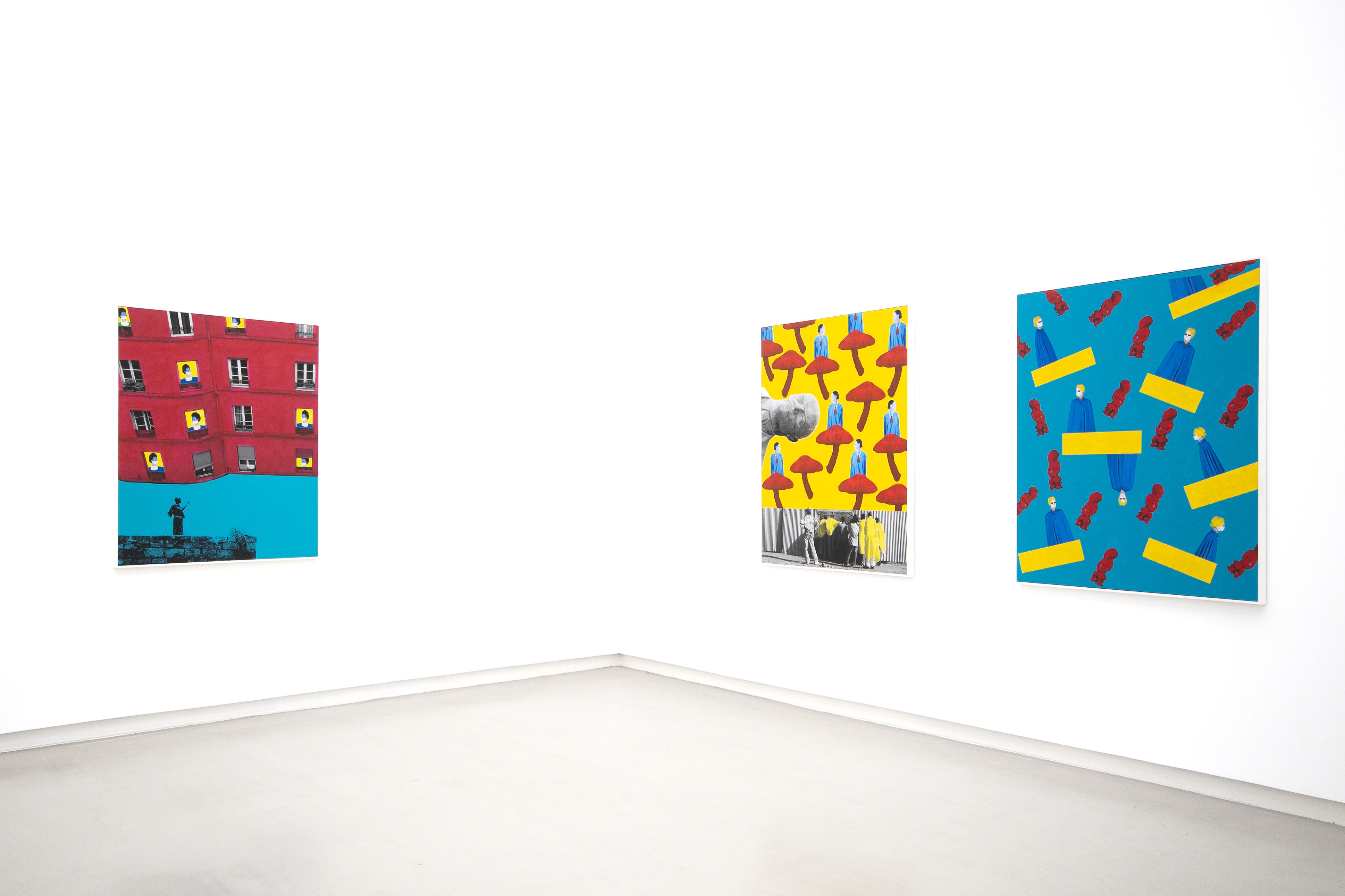 I would nonetheless like to pause on one final image, which introduces a dimension ever present in the series - its playful use of mise en abyme -but which, with Crowd, moves beyond the intimate to express a collective emotion. This collective illusion is reproduced - or at least its effect - through the filter of personal memory. Although the image is planar, the artist introduces depth of field through a stratification of signs that our mind instinctively hierarchises: a dense crowd, a wall punctured by an opening, and at the centre of this breach, two women seemingly surprised to find themselves the focus of attention. Yellow, blue, and black stand out against the monochrome of the rest of the image, contrasting with the greyness that evokes the apathy of the masses, Belonging, Elsewhere. On one side lies the hope of a possible future; on the other, the dreary routine of a laborious daily life. These two women may well be a metaphor for the artist herself, caught between two worlds - a stubborn, burdensome past and an uncertain future.